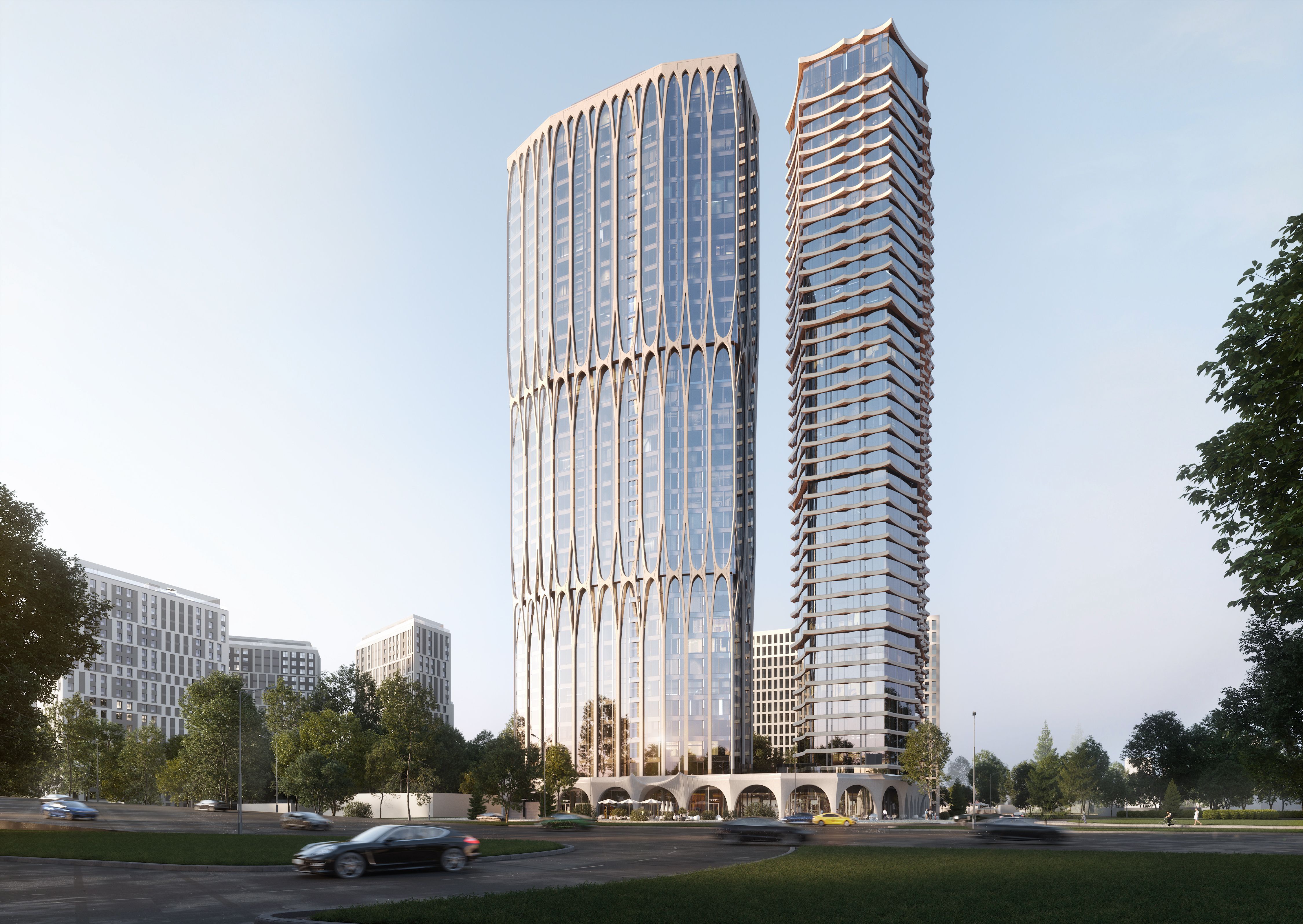 Две высотные башни — 34 и 42 этажа — формируют узнаваемый силуэт и задают масштаб проекта. Попадая сюда, возникает ощущение причастности к продуманной городской среде — современной, собранной, с чётким чувством статуса и приватности. Архитектурная концепция комплекса А22 разработана бюро Apex и представляет собой уникальные стили: готические мотивы и элементы футуристического дизайна.