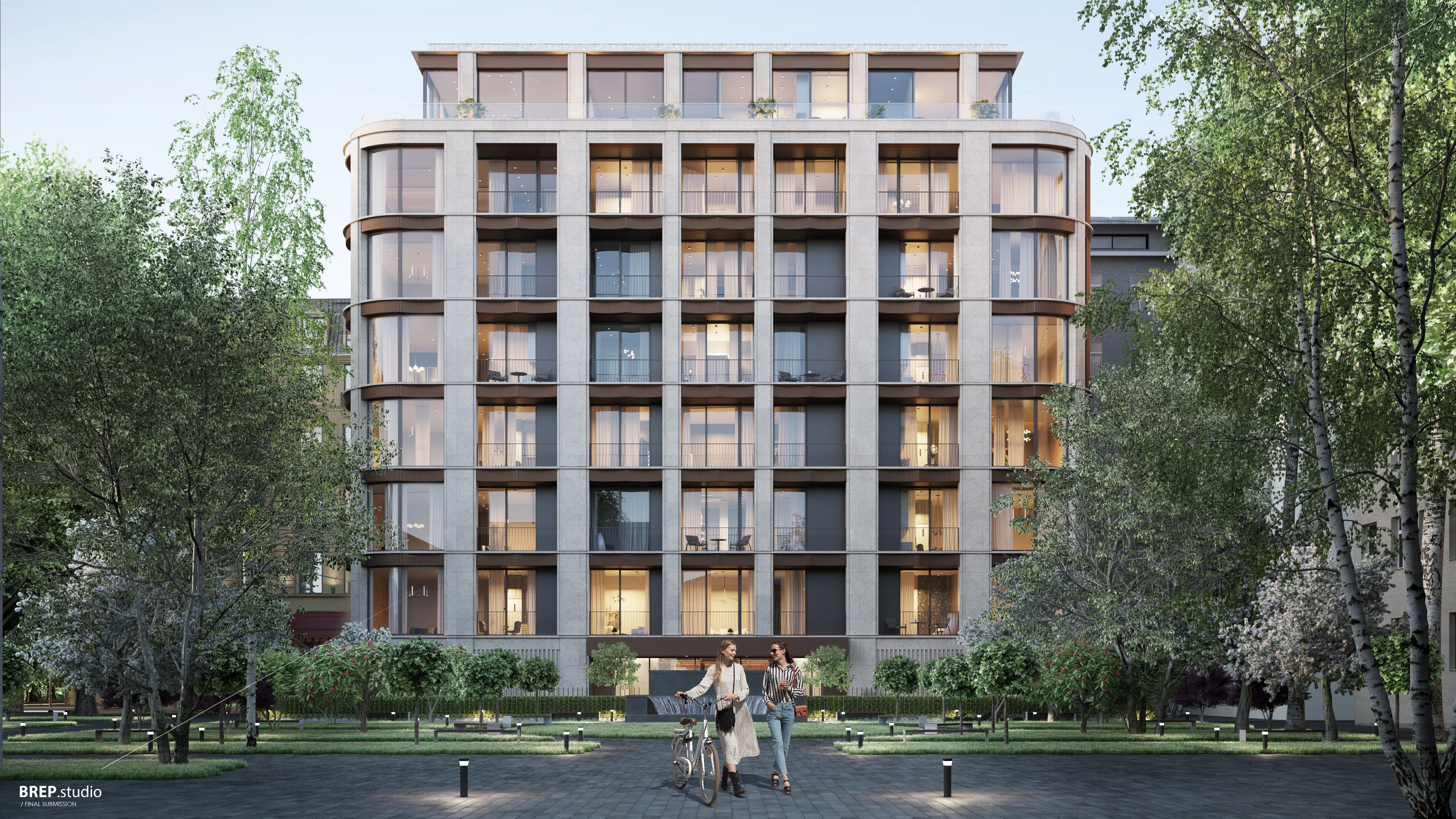 Дом сочетает современные инженерные решения и архитектуру вне времени. Парадный фасад из известняка гармонично вписан в историческую застройку переулка. Просторное лобби с дровяным камином и видом на внутренний двор формирует ощущение комфорта и приватности.
