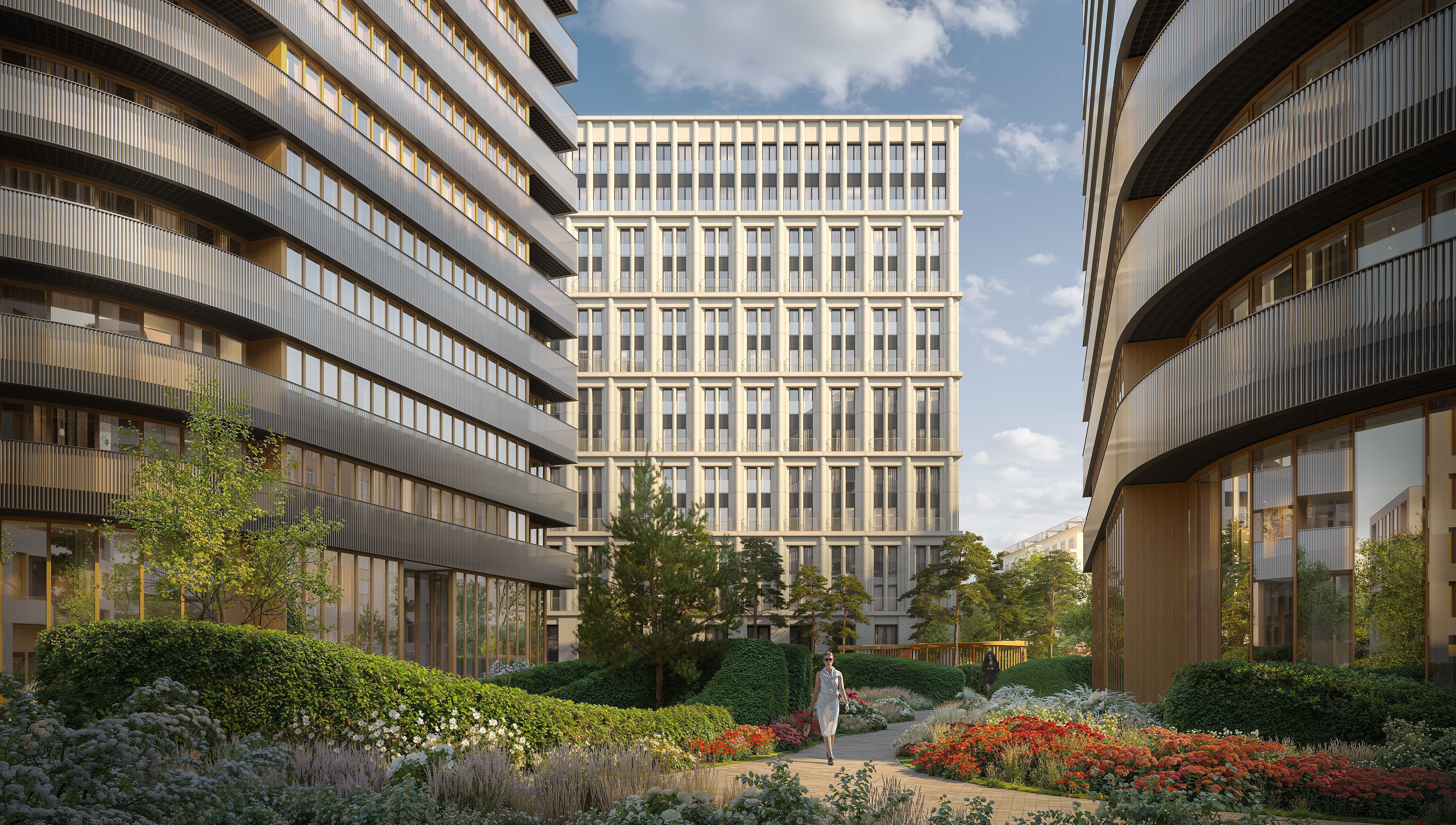 Жилой квартал представляет собой ансамбль клубных домов с малой этажностью, среди которых авангардные корпуса соседствуют с неоклассическими и стеклянными современными домами. Богатый ассортимент форматов жилья включает двухуровневые квартиры, пентхаусы, виллы и ситихаусы, с уникальными атрибутами: патио, террасы, дровяные камины, бассейны, потолки до 7 метров. Панорамные окна открывают виды на центр города, Кремль, Москву-реку и приватный витражный парк.
