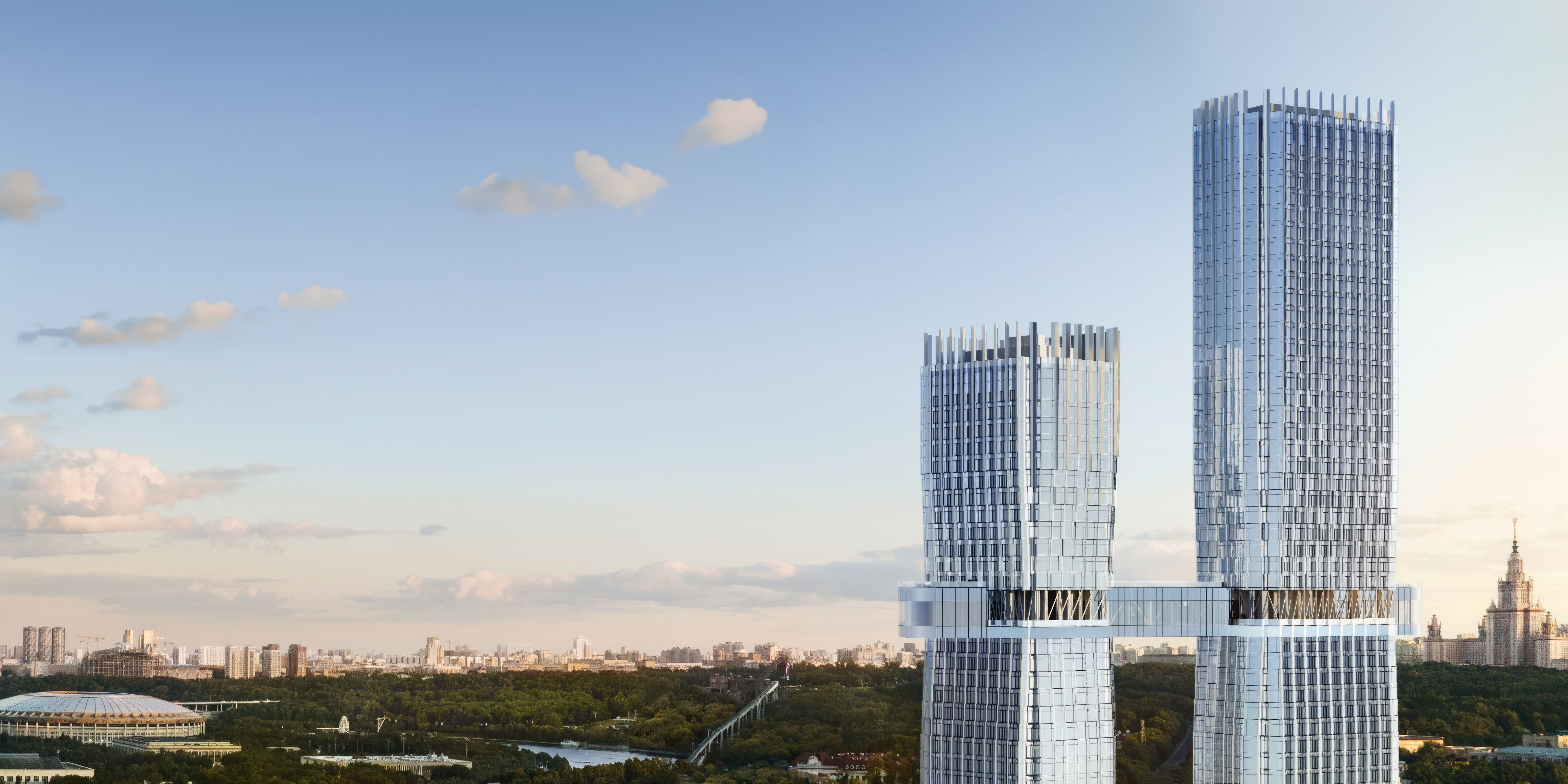 Ключевая идея проекта — мост на высоте 80 метров, соединяющий башни. В его центре расположен SocialHUB — приватное пространство для резидентов и их гостей. Это 16 функциональных зон для работы, отдыха и встреч, выполненных в клубном формате и доступных только жителям.