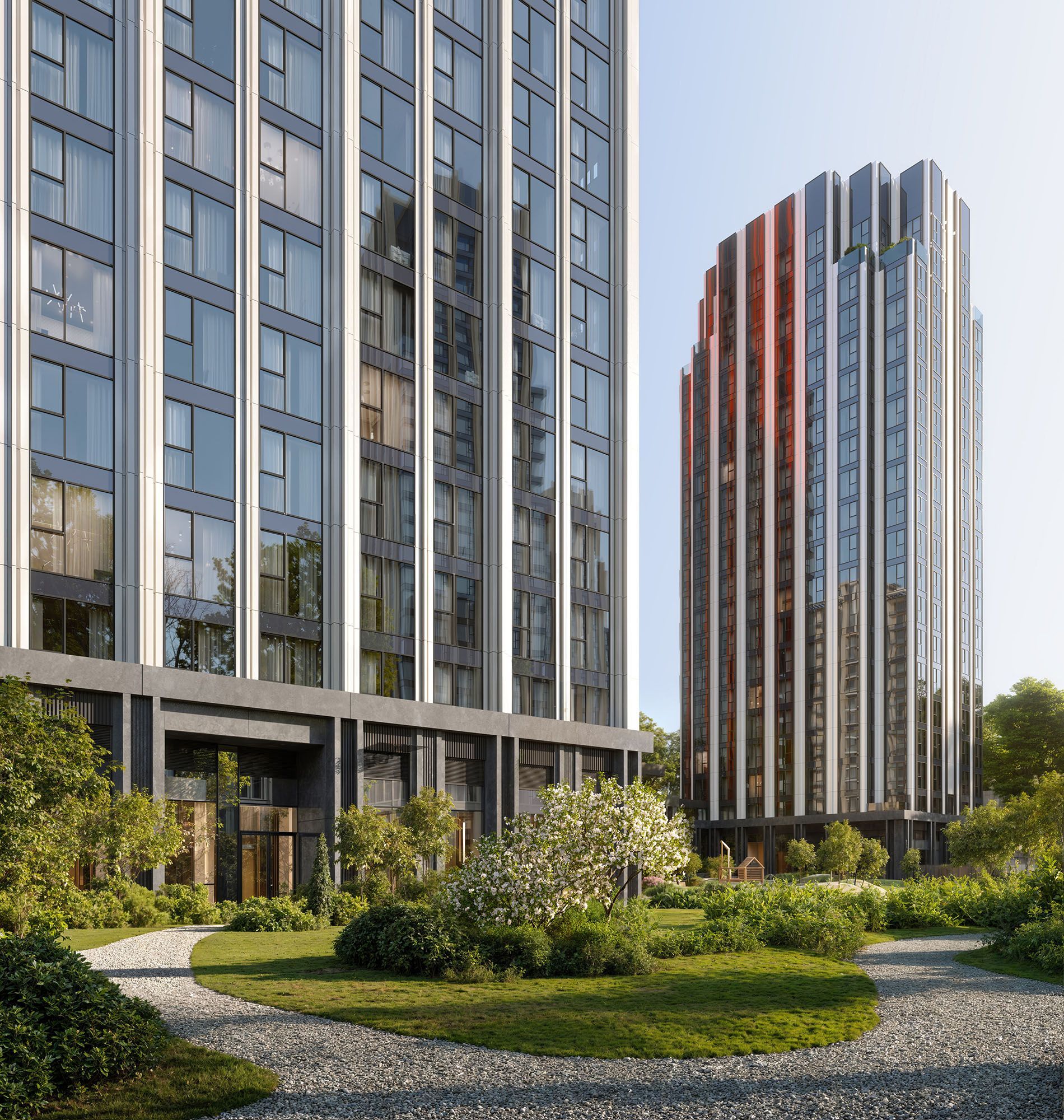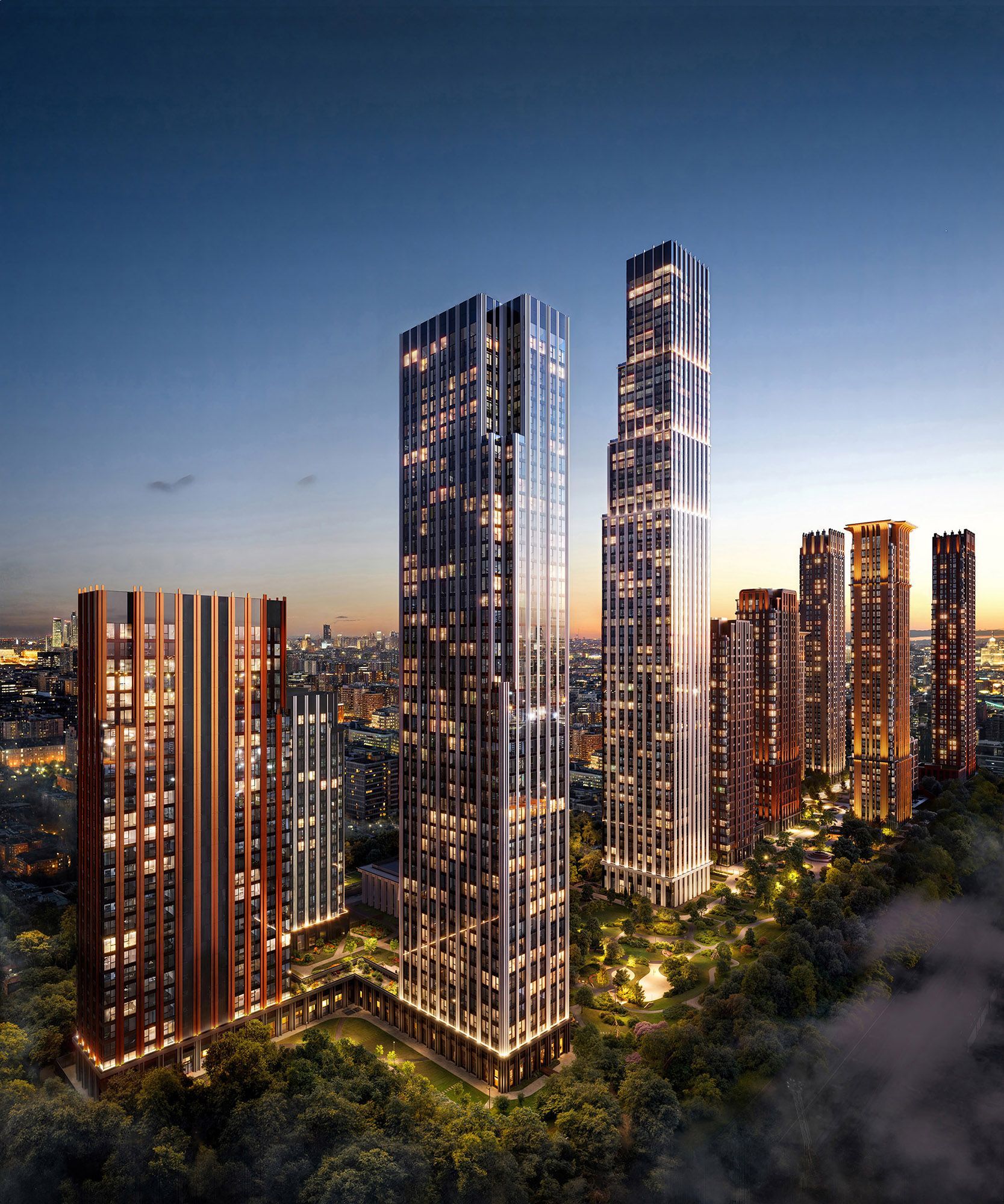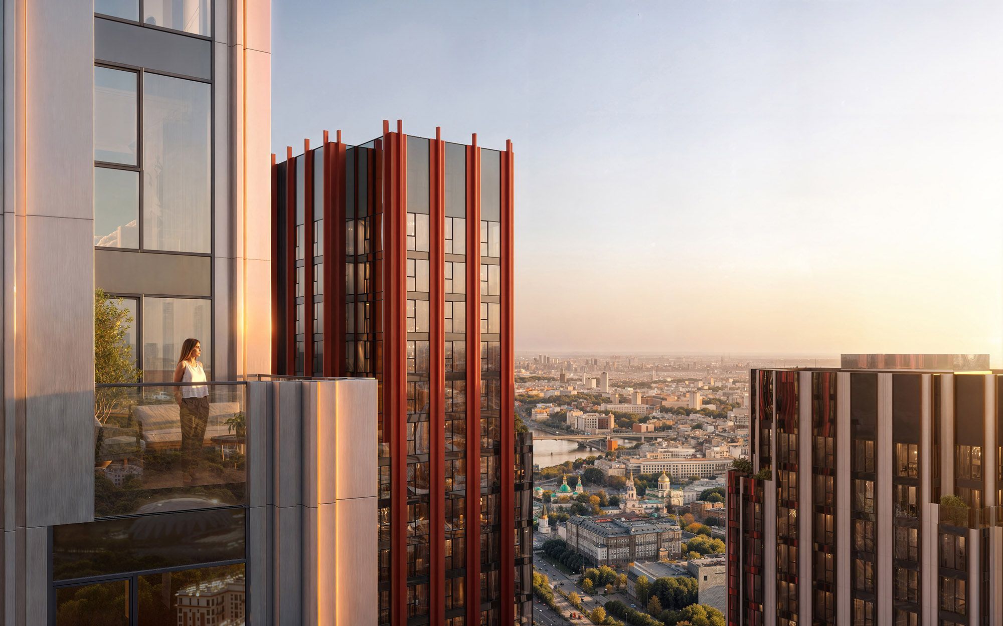 Проект формирует новую городскую доминанту: 15 корпусов разной высотности складываются в выразительный силуэт, заметный издалека и органично встроенный в панораму центра Москвы. Архитектура комплекса выполнена в современном переосмыслении ар-деко. Чёткая геометрия, вертикальные ритмы фасадов и благородные пропорции создают ощущение статуса. Концепция разработана совместно с бюро СПИЧ.