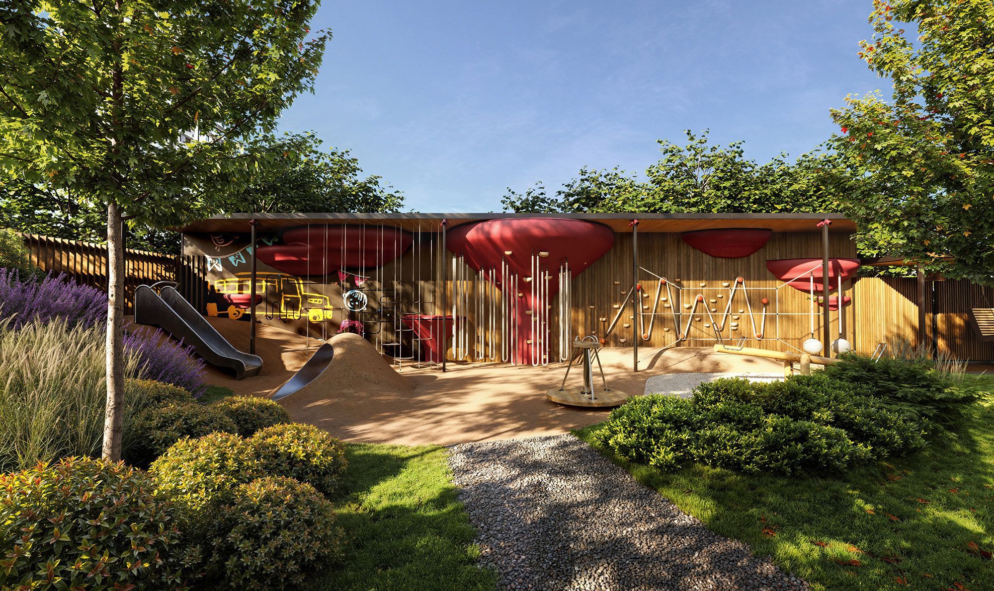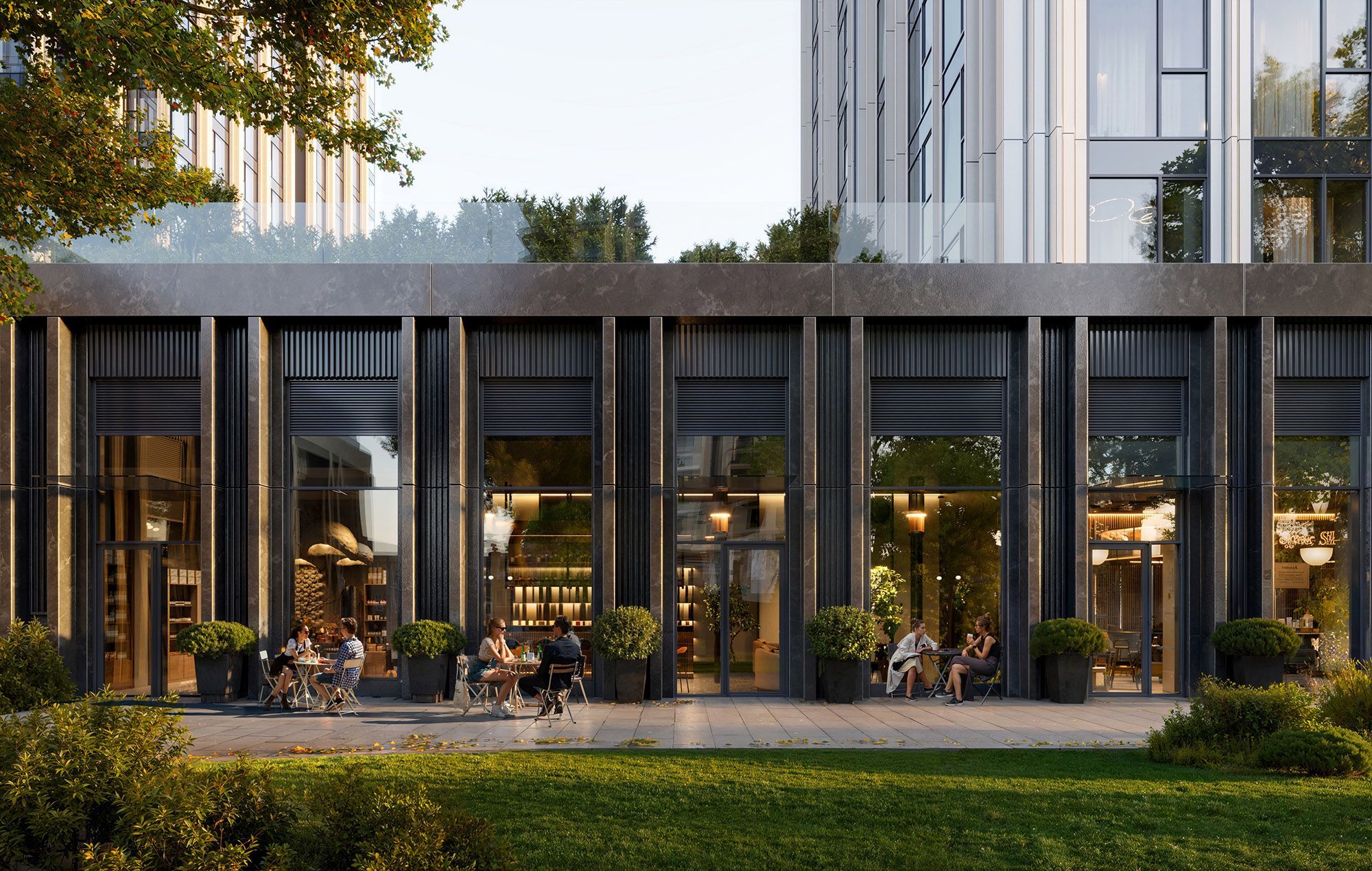 Внутренняя территория Level Павелецкая Сити — закрытый от машин двор площадью более 4,6 га. Пространство спроектировано бюро GAFA и построено на мягкой геопластике и плавных линиях. Здесь есть камерные зоны отдыха, детские площадки для разных возрастов, спортивные пространства, настольный теннис и крытая галерея с качелями — для спокойной работы или отдыха на свежем воздухе. Проект изначально задуман как самодостаточная среда. В стилобате и на первых этажах разместятся коммерческие помещения с повседневными сервисами, кафе и магазинами. В составе комплекса — собственный фитнес-клуб, детский центр, школа на 720 мест и детский сад на 175 мест, входящие в структуру школы №627 с профильными образовательными направлениями.