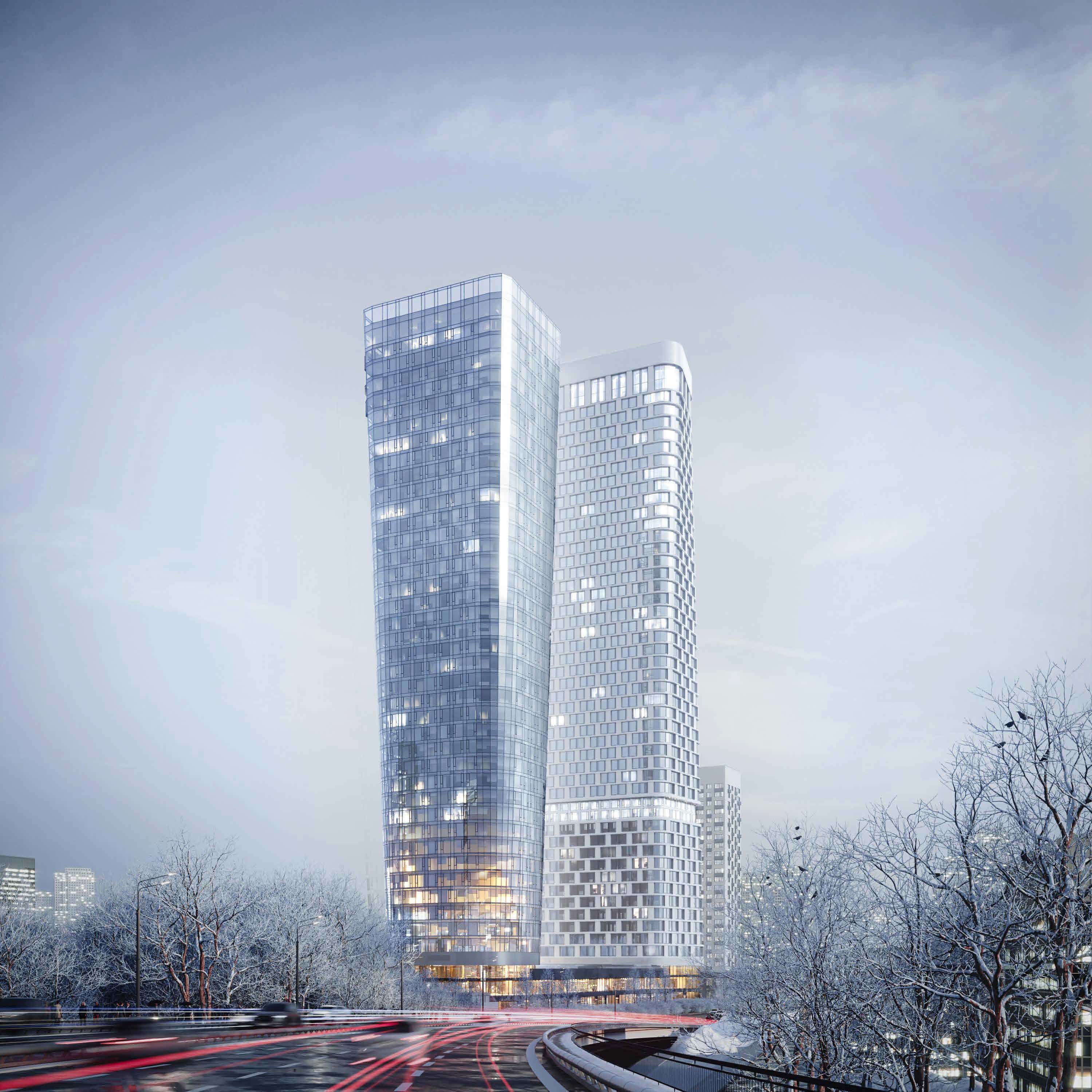 С первых минут возникает ощущение жизни в особой, спокойной и созидательной среде. Форма башен подчёркивает индивидуальность проекта: одна имеет круглое основание, вторая — спиралевидное. С высоты 10-го этажа объёмы переходят в строгую геометрию, создавая баланс пластичности и порядка. Полностью стеклянные фасады с панорамными окнами усиливают ощущение света, воздуха и визуальной связи с парком.