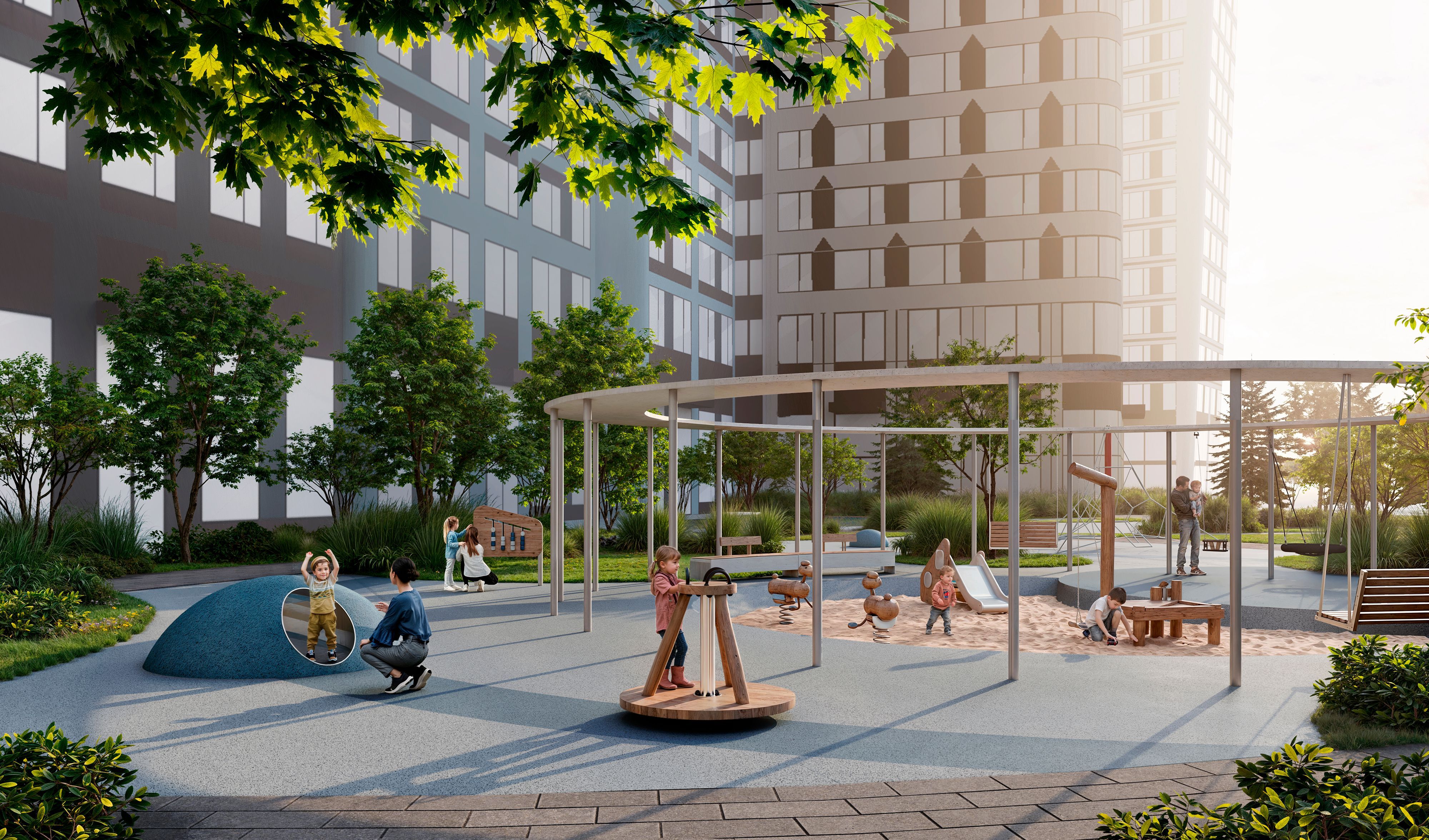 Внутренние дворы закрыты от машин и посторонних. Просторные зелёные пространства, детские площадки, воркауты, прогулочные дорожки и тихие уголки для отдыха формируют безопасную и приватную среду для детей и взрослых. Территория круглосуточно охраняется и продумана до мелочей.
