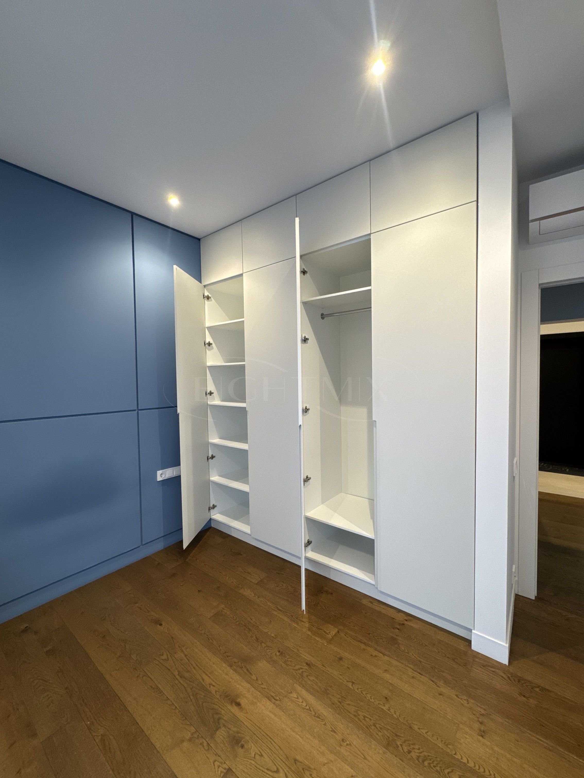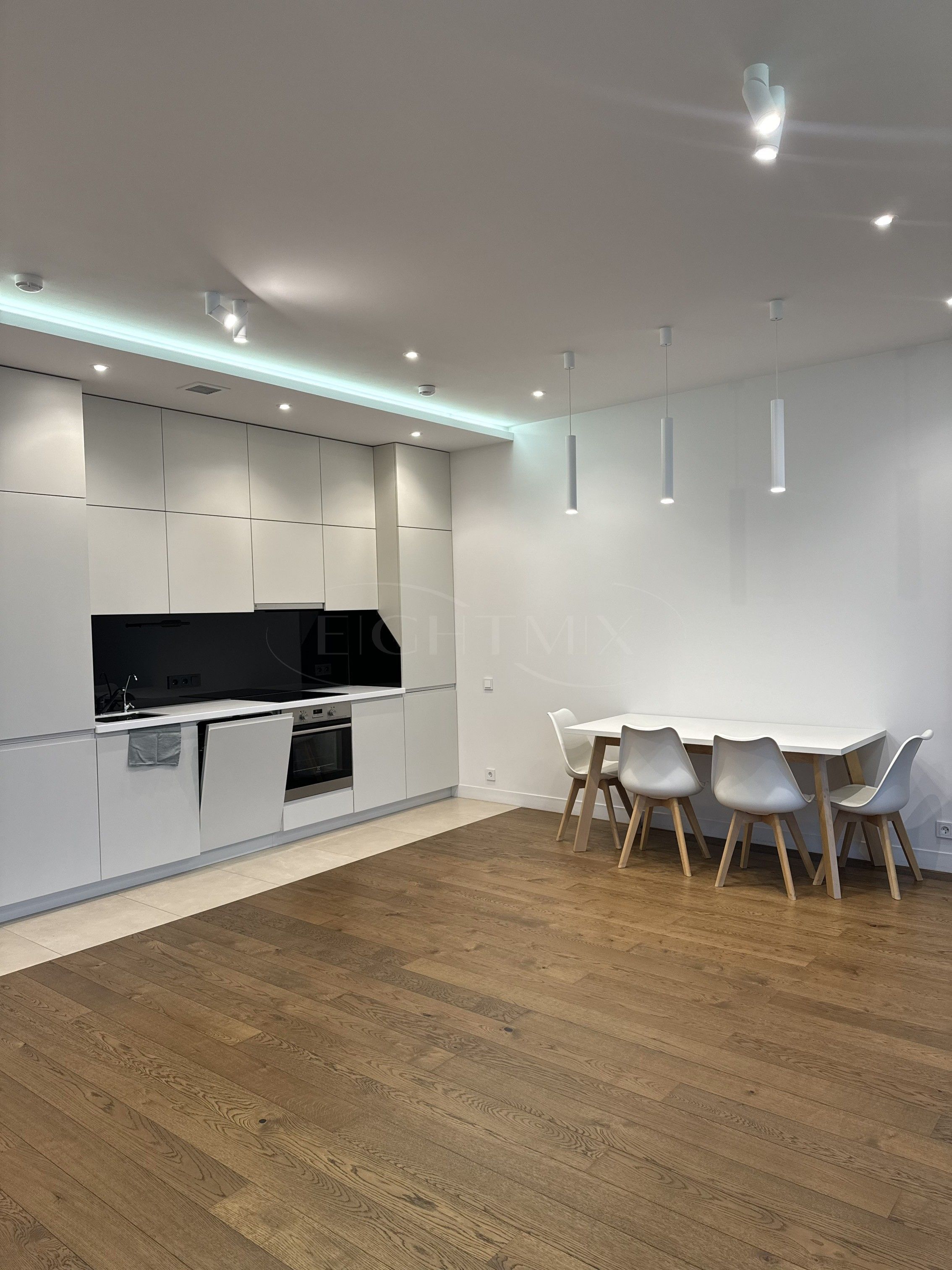 Интерьер выполнен с использованием высококачественных материалов: пол — инженерная доска POLARWOOD, санузлы облицованы керамогранитом ITALON. Кухня оснащена встроенным кухонным гарнитуром, в прихожей и спальне установлены встроенные шкафы с фасадами МДФ и фурнитурой BLUM. Комфорт обеспечивают кондиционеры LG с закрытой дренажной системой, подключённые к общедомовой VRV-мультисистеме.
