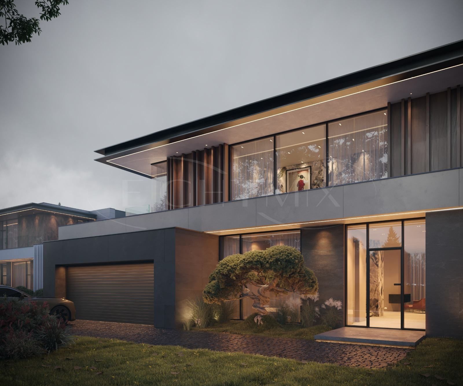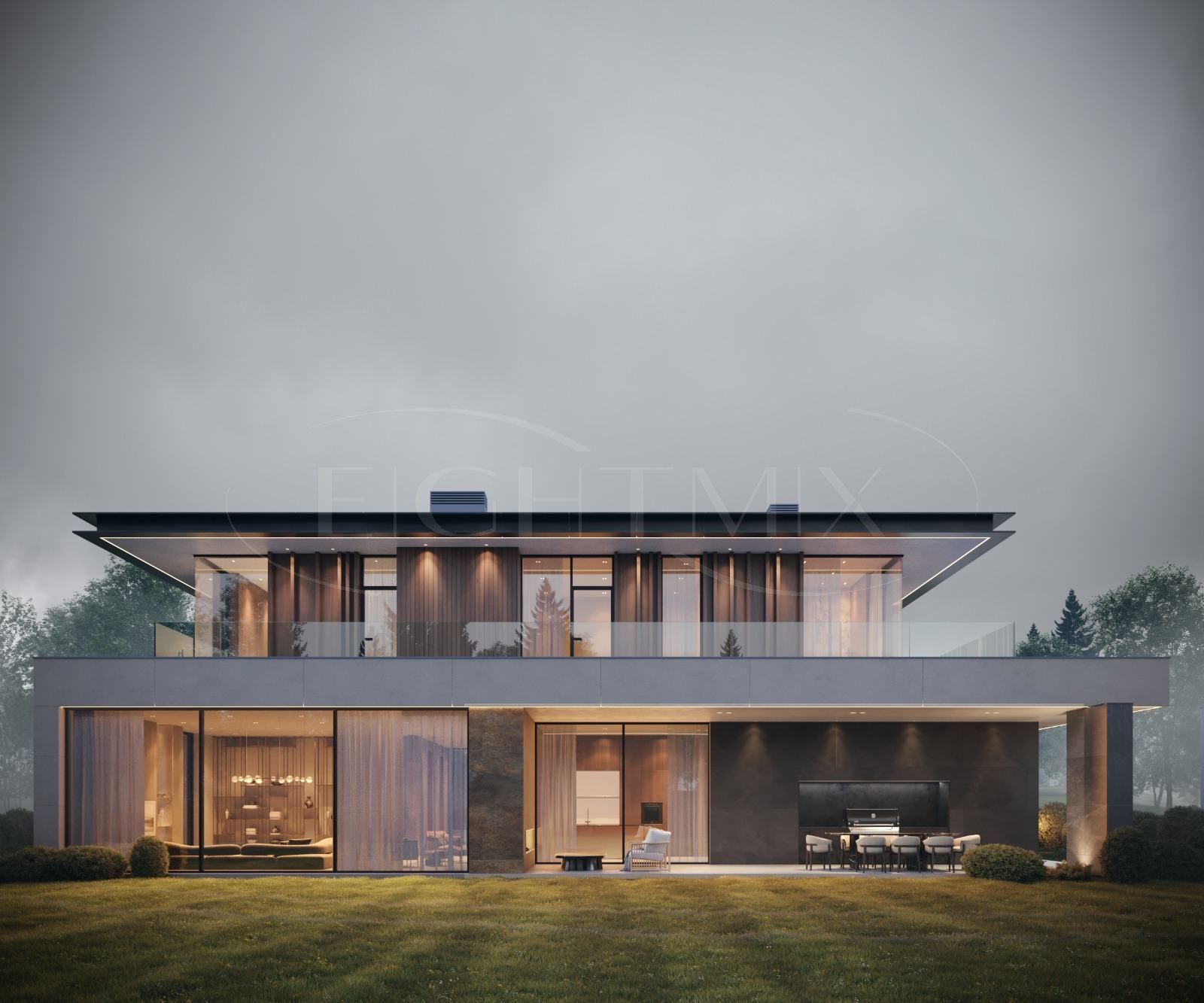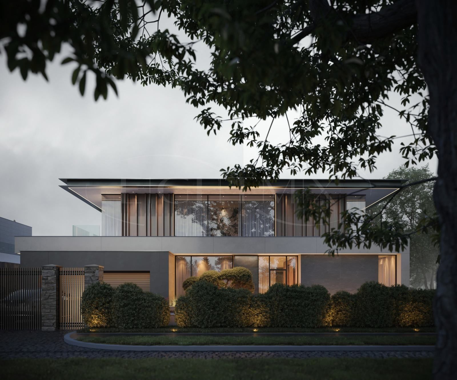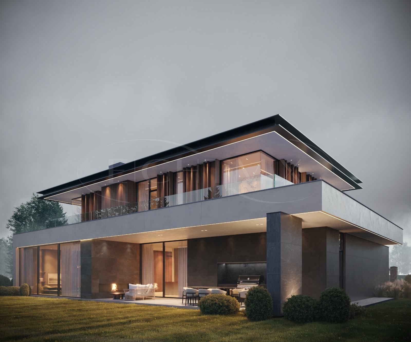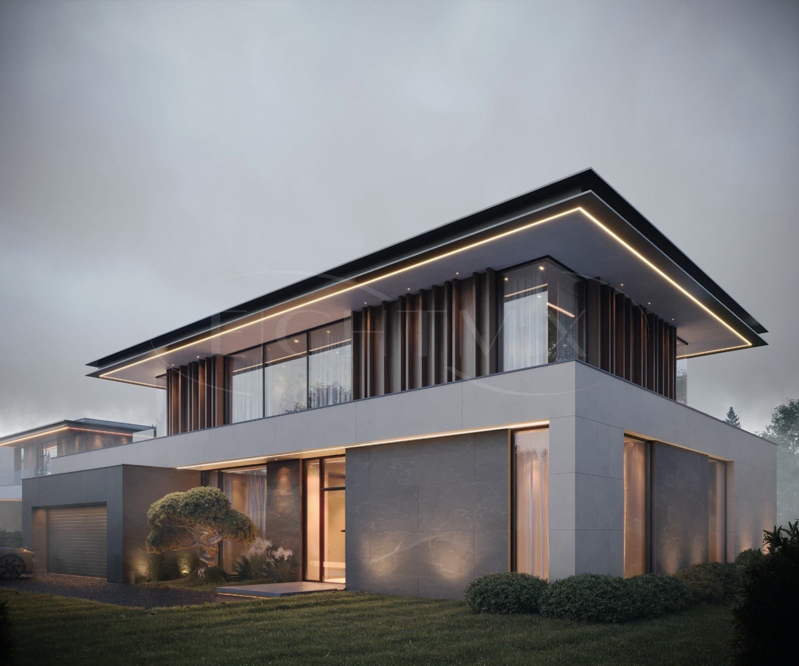 - На первом этаже: кухня-столовая с выходом на террасу, уютная гостиная, кабинет, а также гараж и кладовые для хранения.