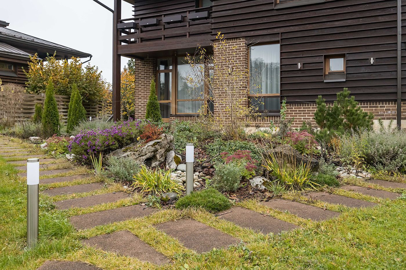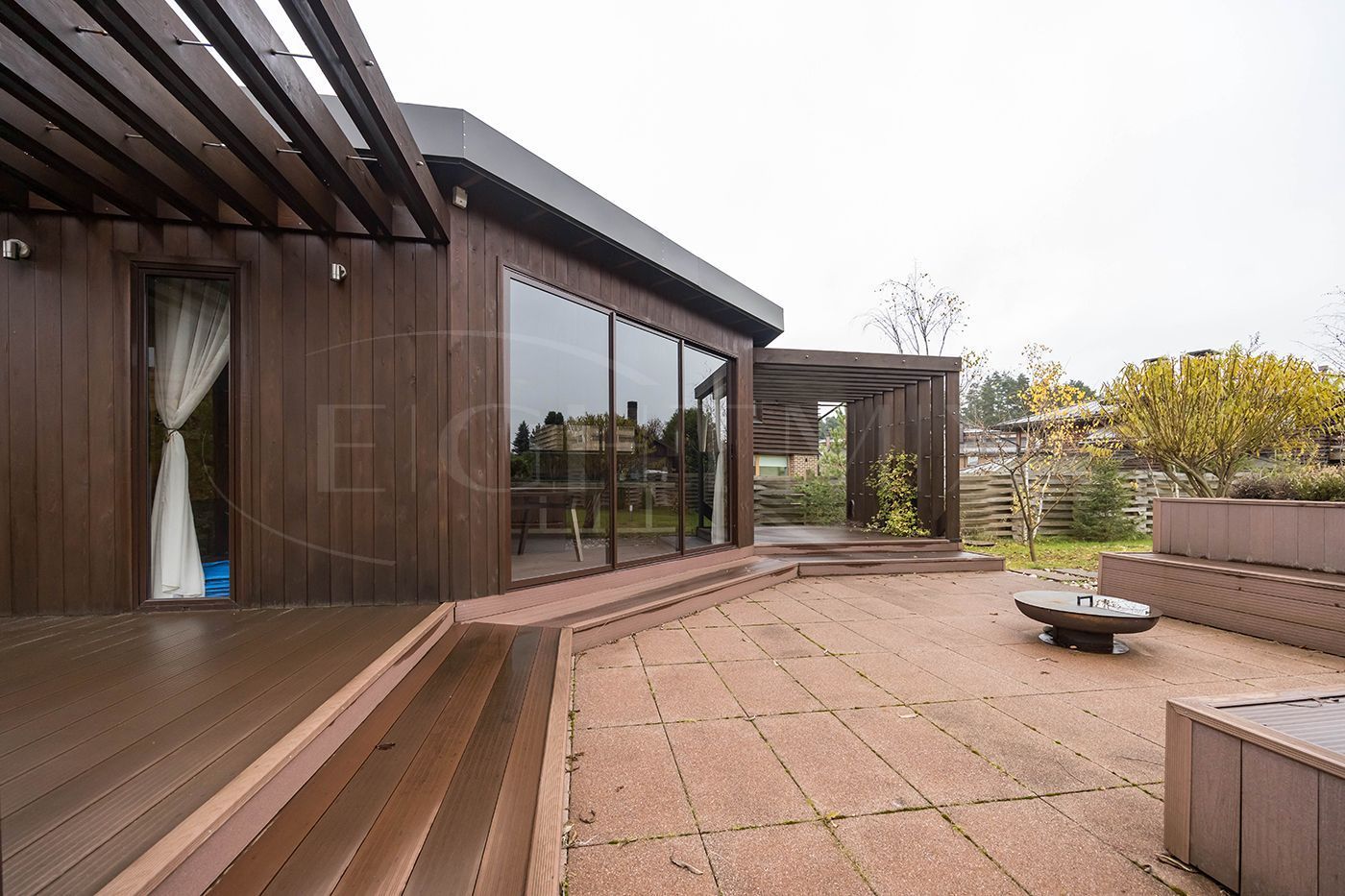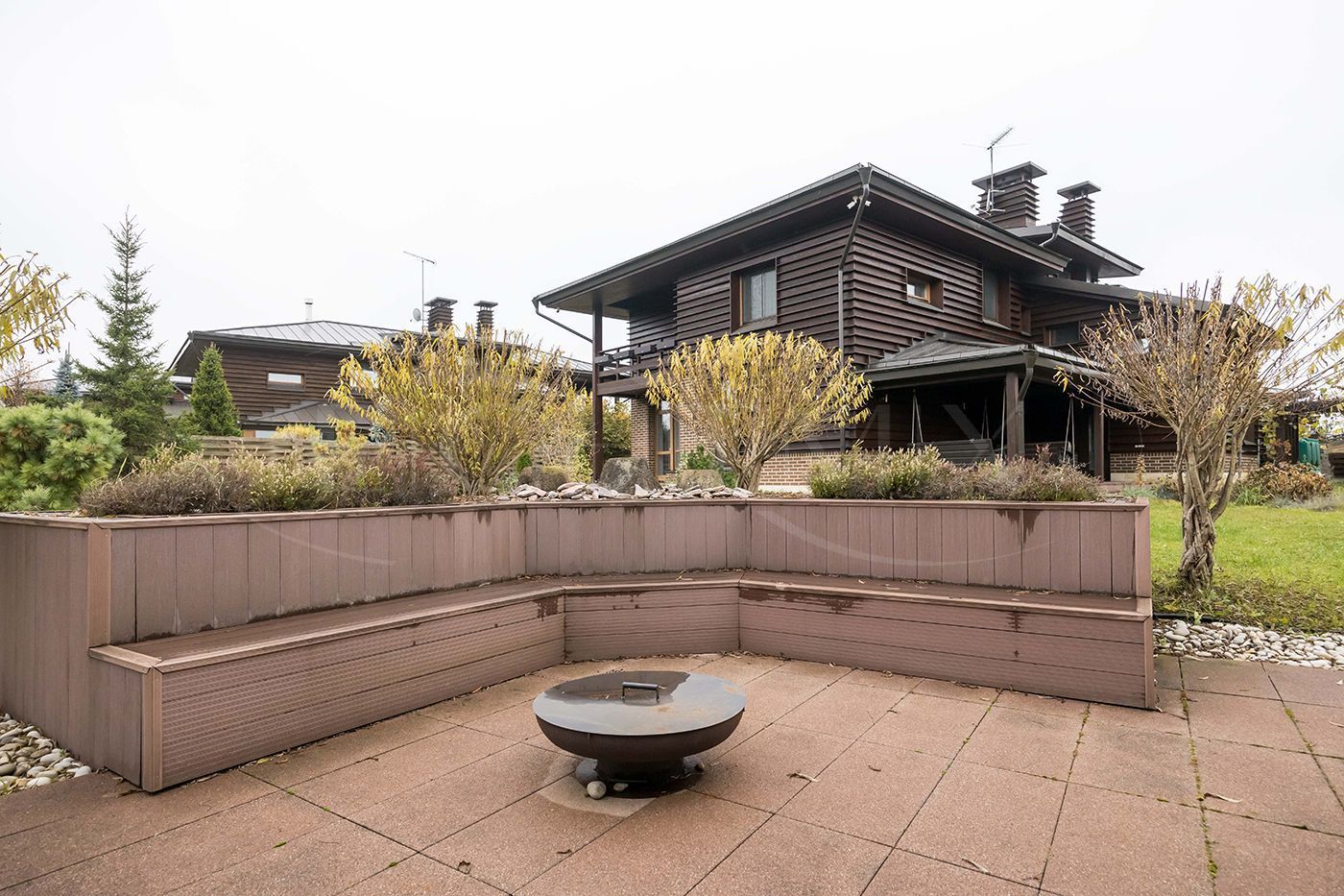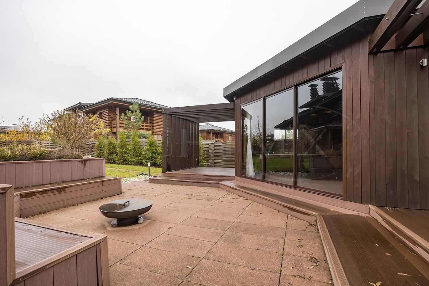 На участке выполнен ландшафтный дизайн, построена беседка. Беседка – каменная столешница, мангал , зона для казана, вода подведена, много шкафов для хранения, длинный стол со стульями. Панорамные раздвижные двери, с видом на зону отдыха с костровищем.