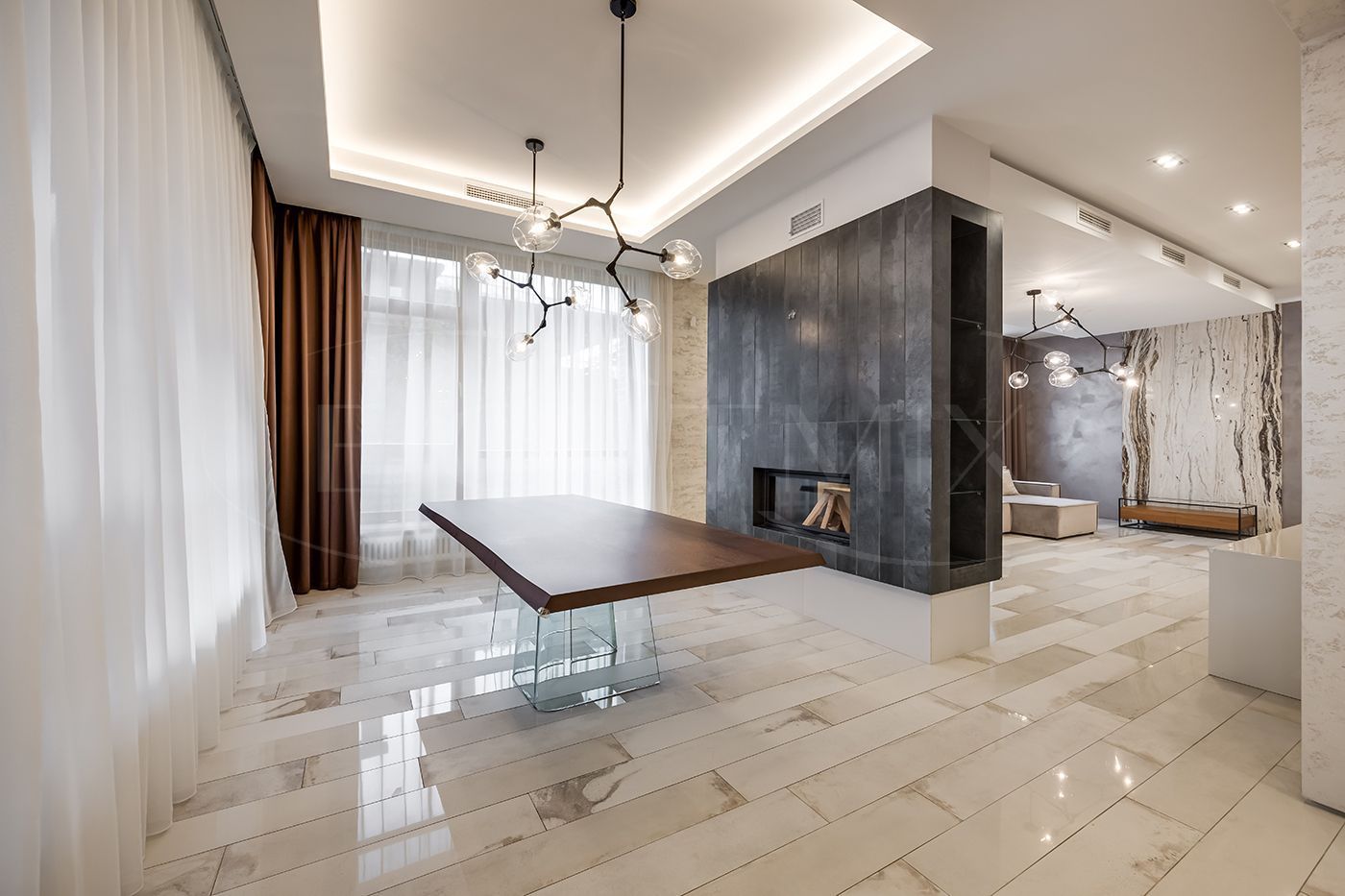 Камин двусторонний разделяет пространство столовой и гостиной. Имеются отдельные 2 выхода на задний двор.