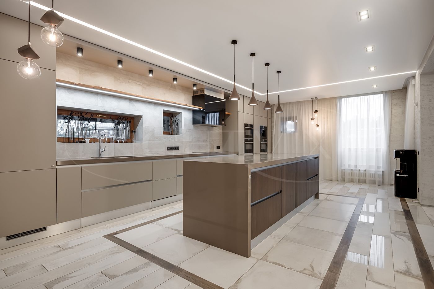 Кухня Scavollini (Италия), каменная столешница на острове и кухне, встроенная техника Neff (кофемашина, 3 единицы дух шкафов, посудомойка), холодильник, морозильная камера, измельчитель.