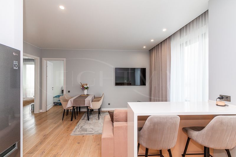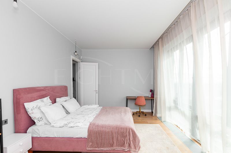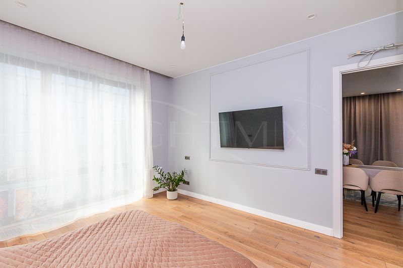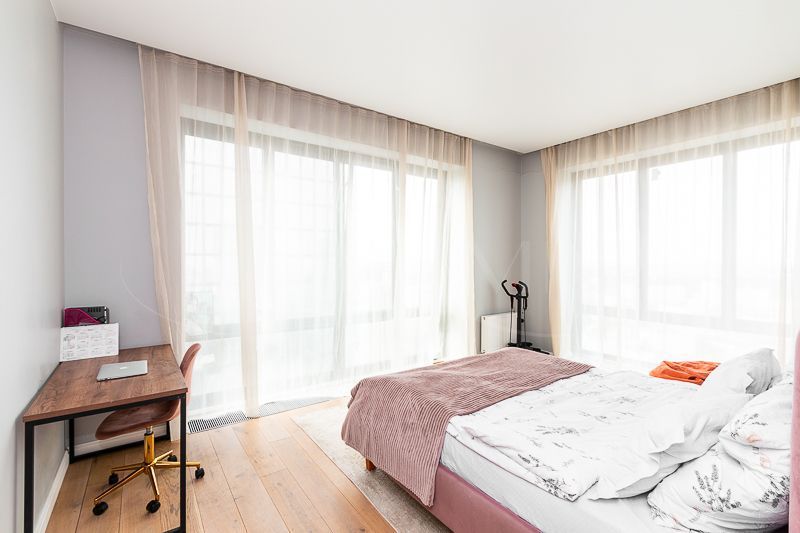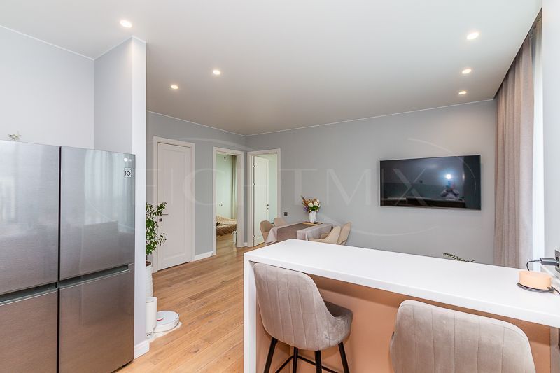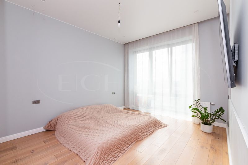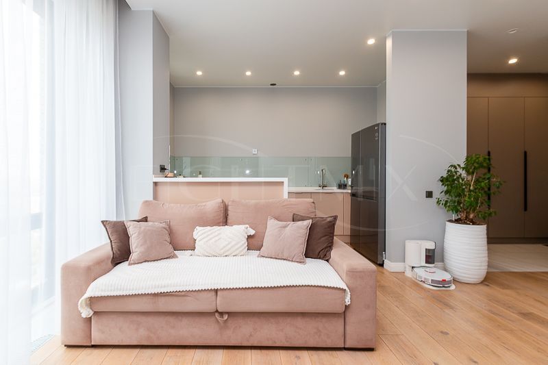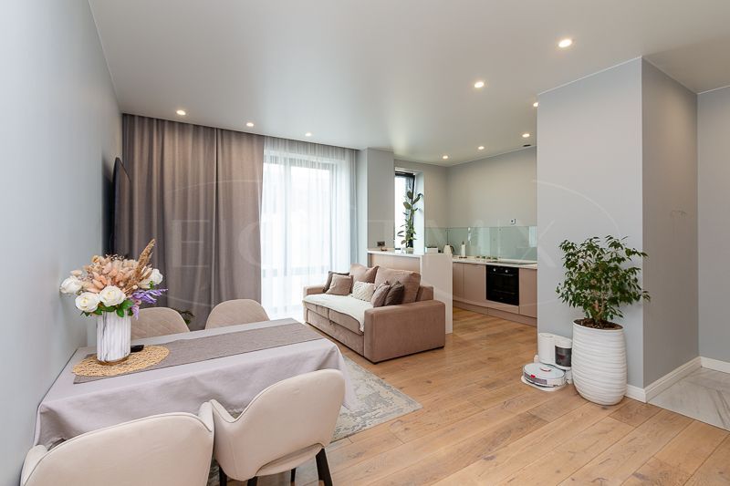 Квартира очень светлая благодаря панорамным окнам (от пола до потолка). Большая гостиная с кухней и две изолированные спальни. Большой гардероб при входе (глубина 60 см), полноценный санузел с ночной подсветкой. Общая площадь квартиры 74,7 кв.м.