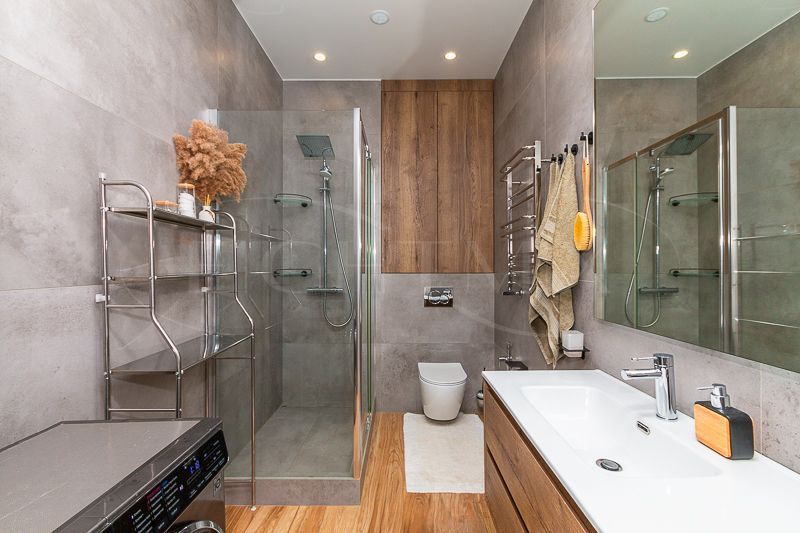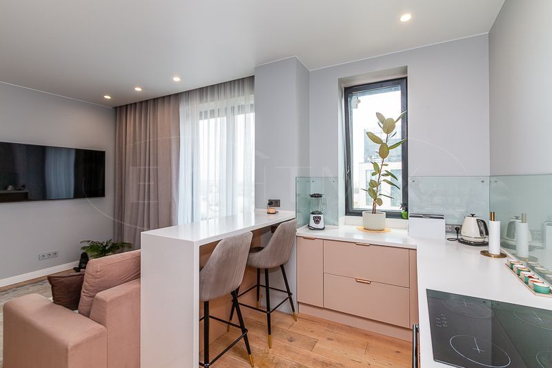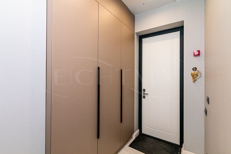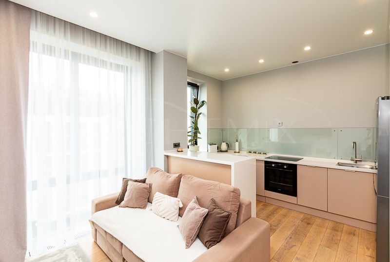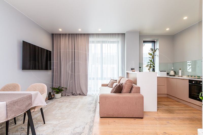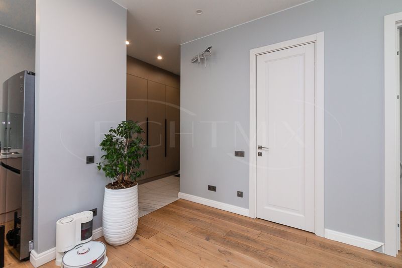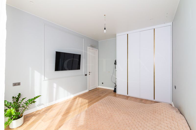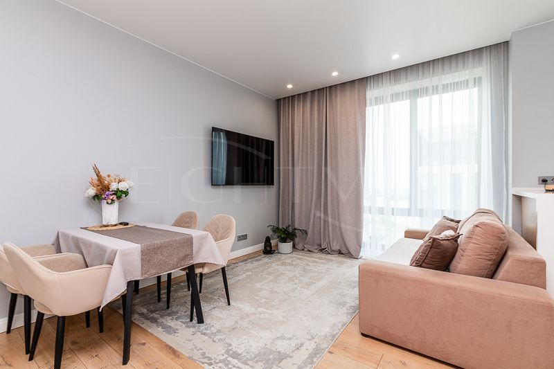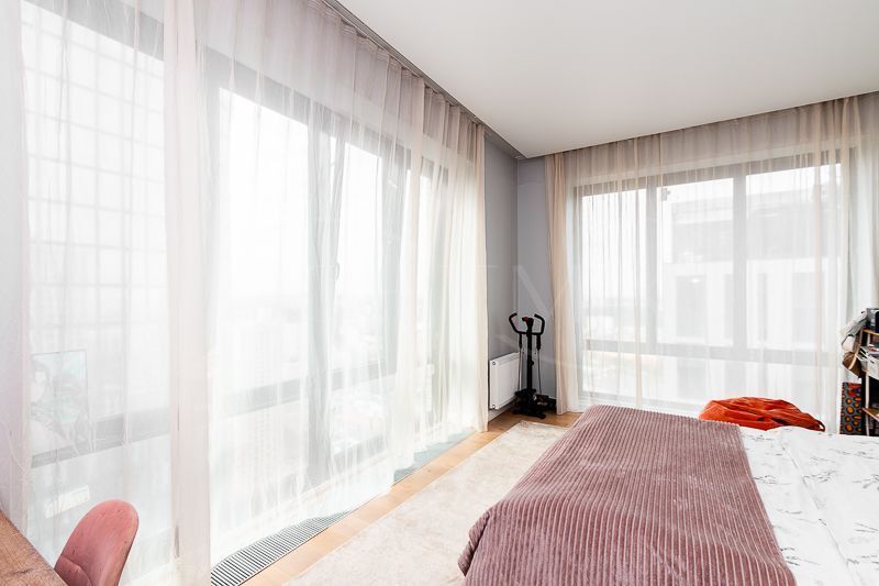 Квартира очень светлая благодаря панорамным окнам (от пола до потолка). Большая гостиная с кухней и две изолированные спальни. Большой гардероб при входе (глубина 60 см), полноценный санузел с ночной подсветкой. Общая площадь квартиры 74,7 кв.м.