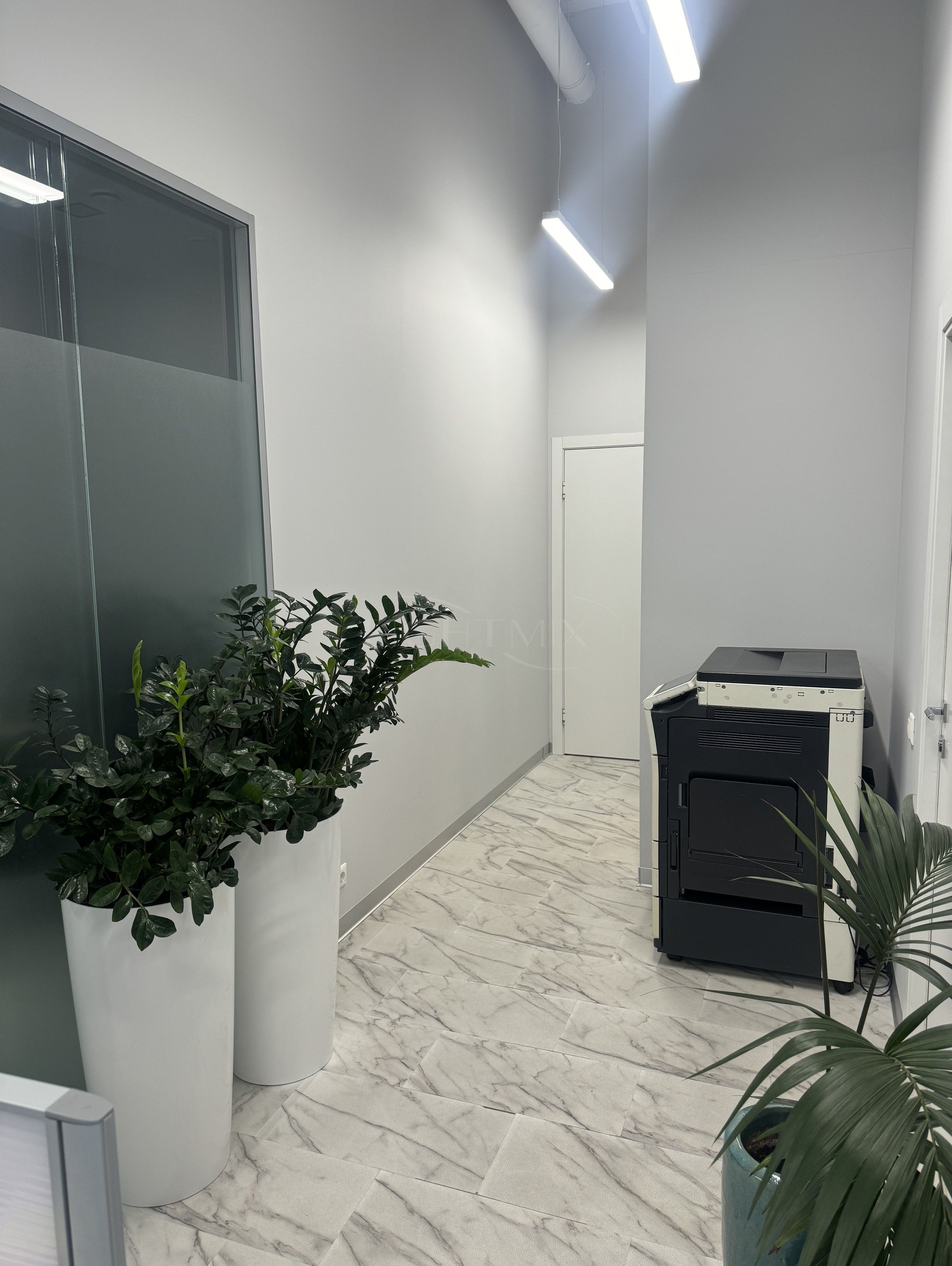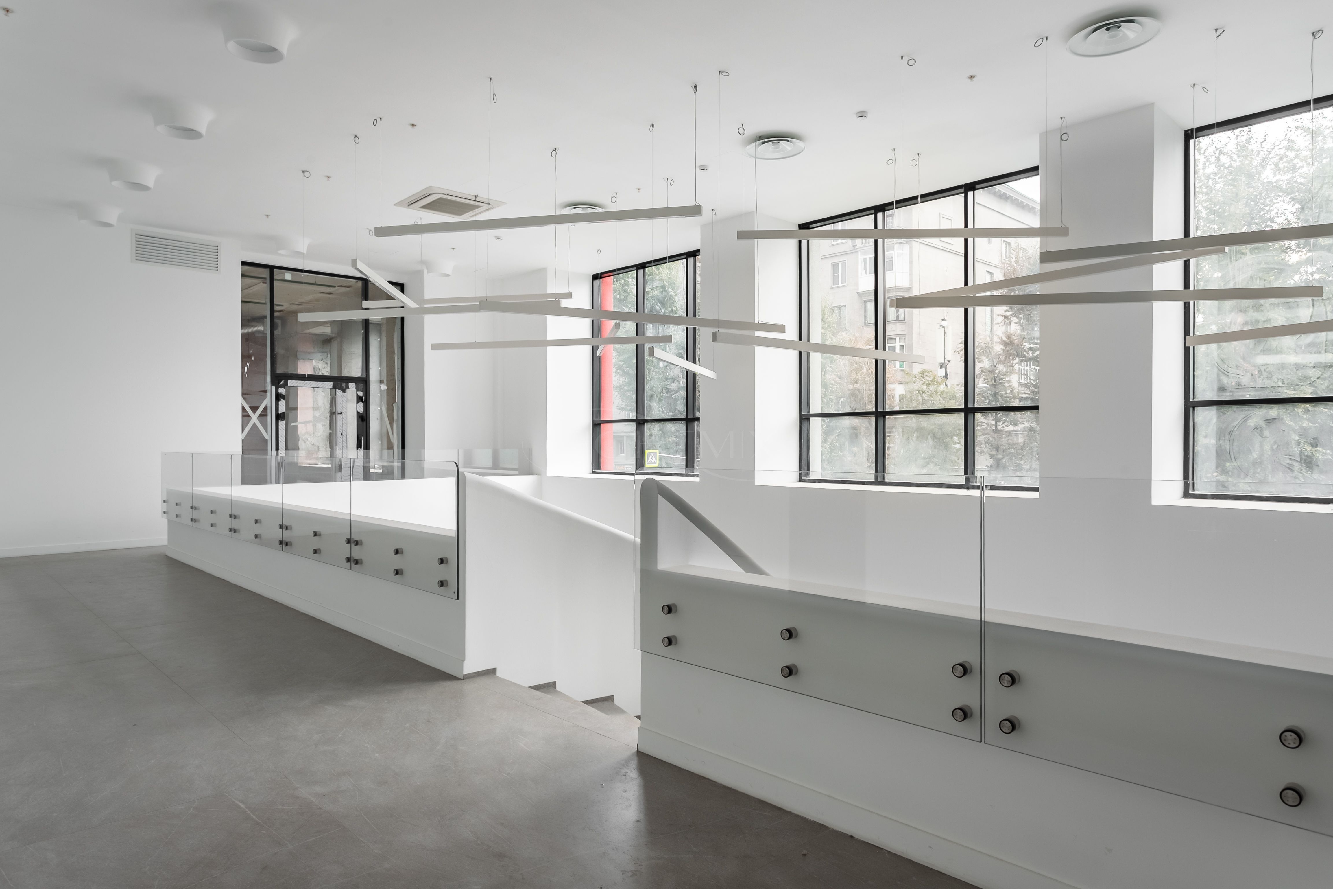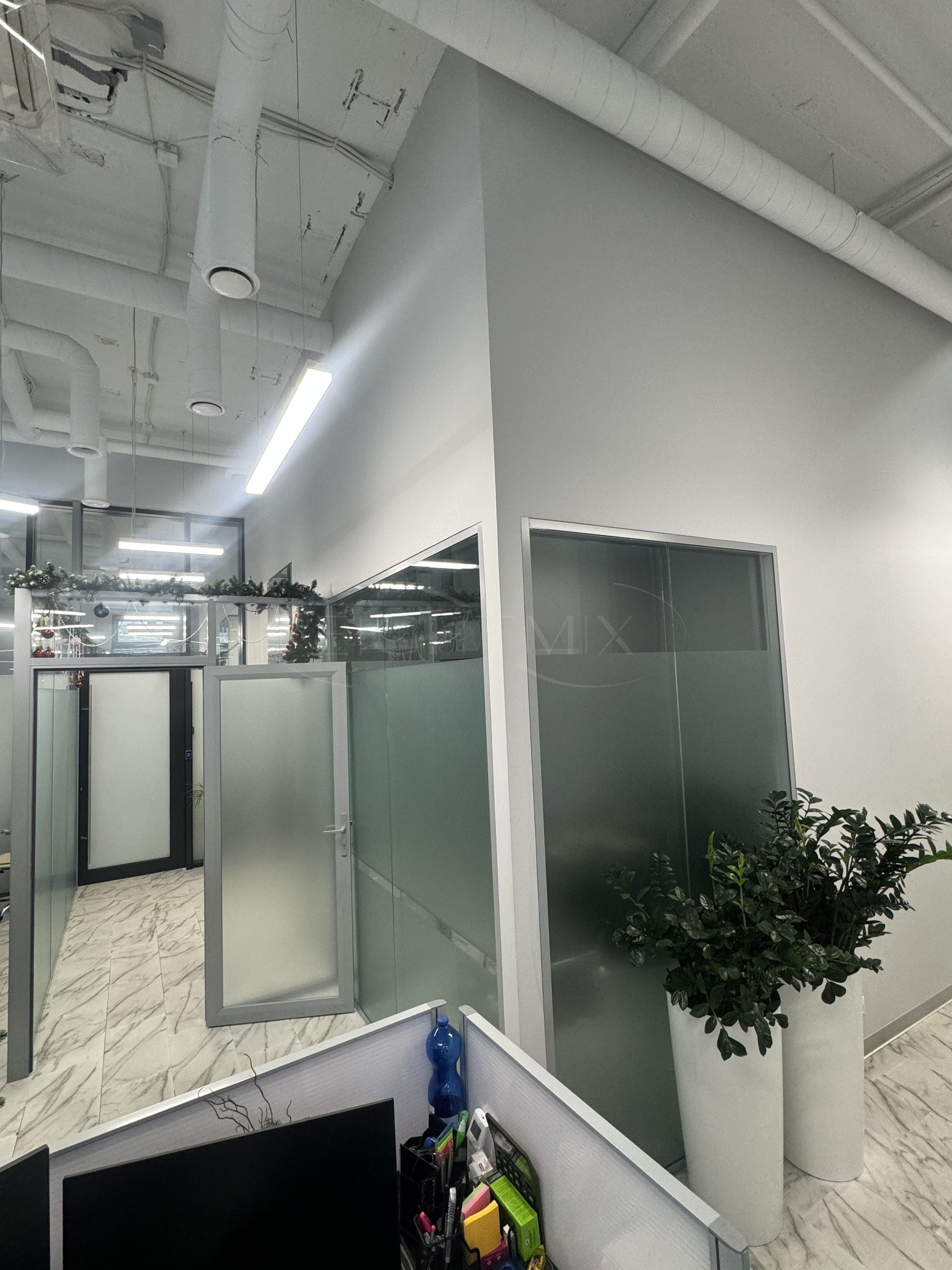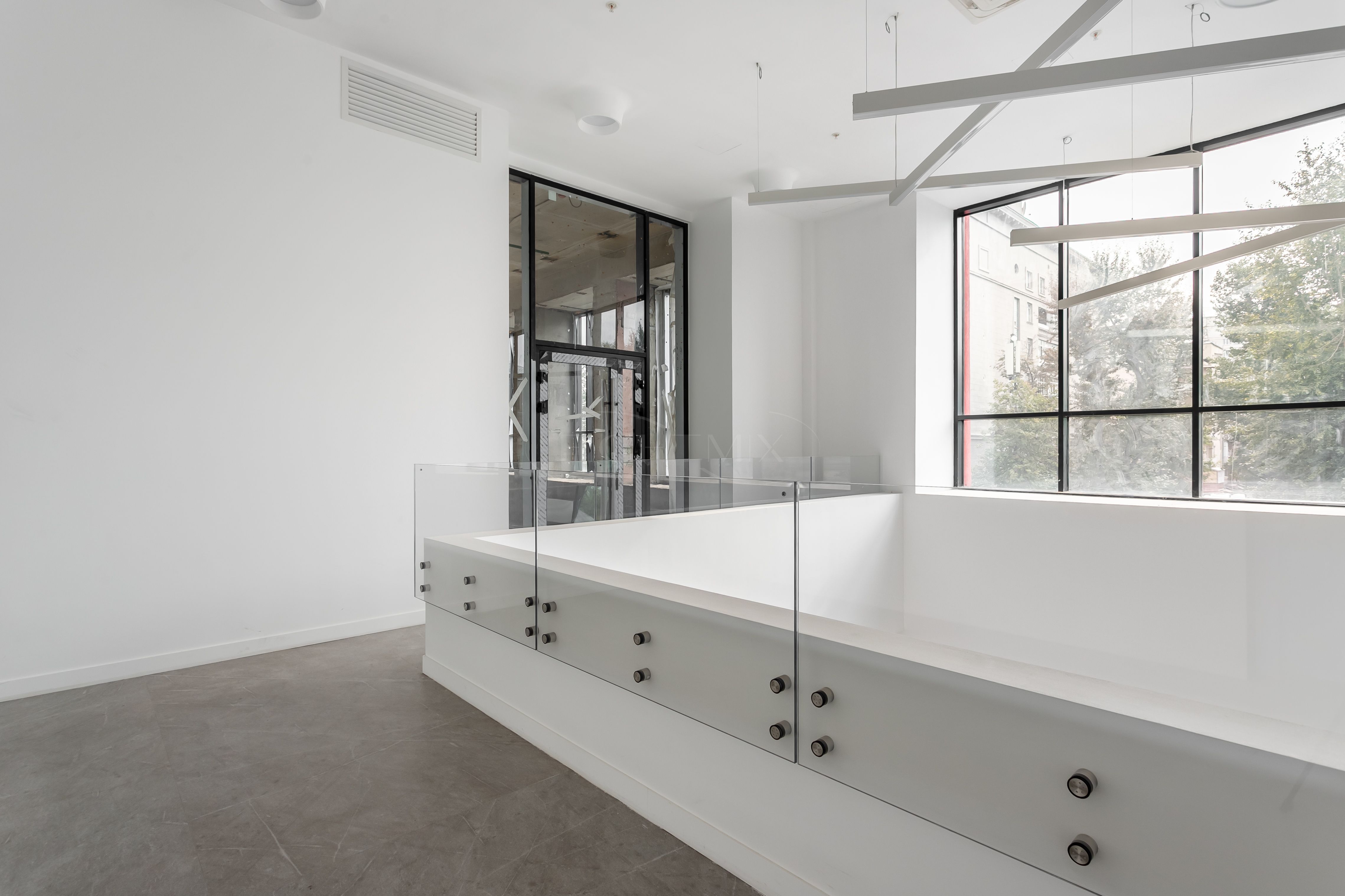 В помещении выполнен евро-ремонт. Санузел на 2 кабины, переговорная, 2 отдельных кабинета, опен-офис, кухня, кладовая, вспомогательная закрытая лестница. Высота потолка 4 метра, увеличенные оконные проемы.