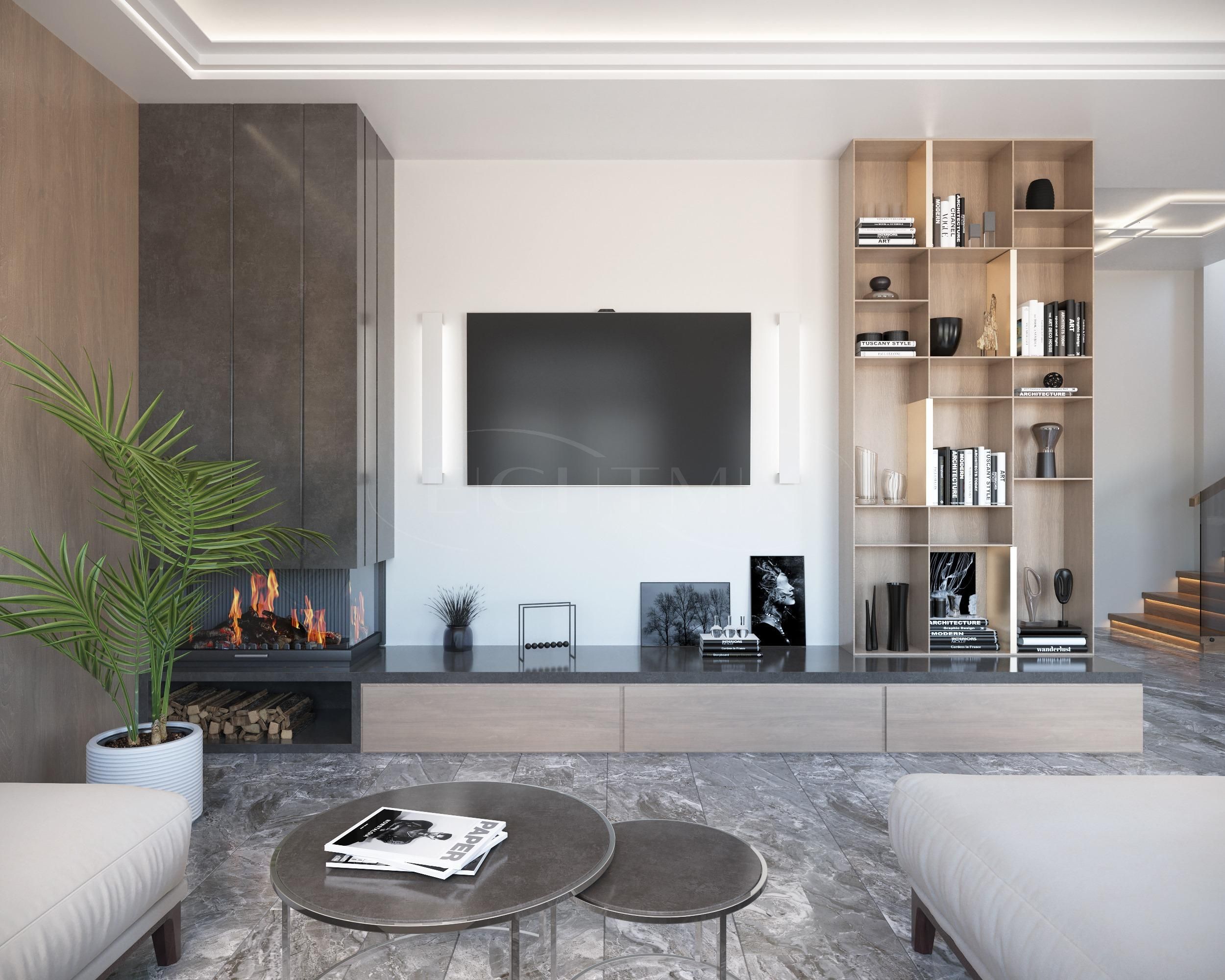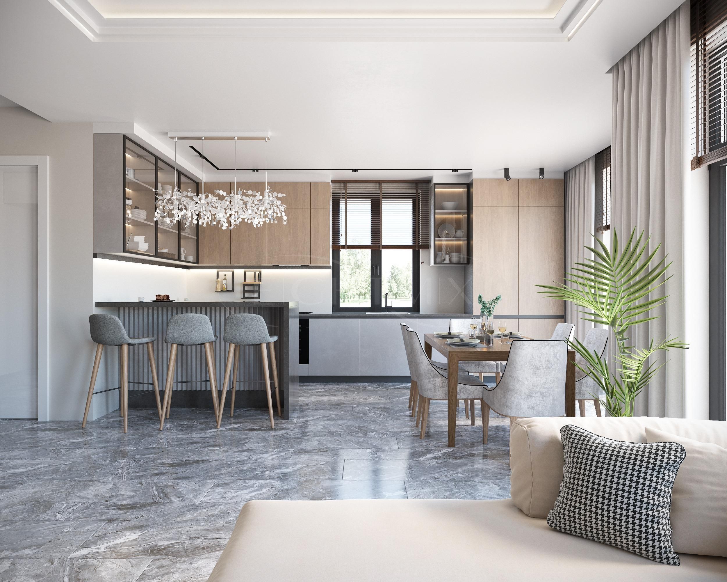 - 1 этаж: кухня, просторная гостиная, с/у и техническое помещение, спальная комната;