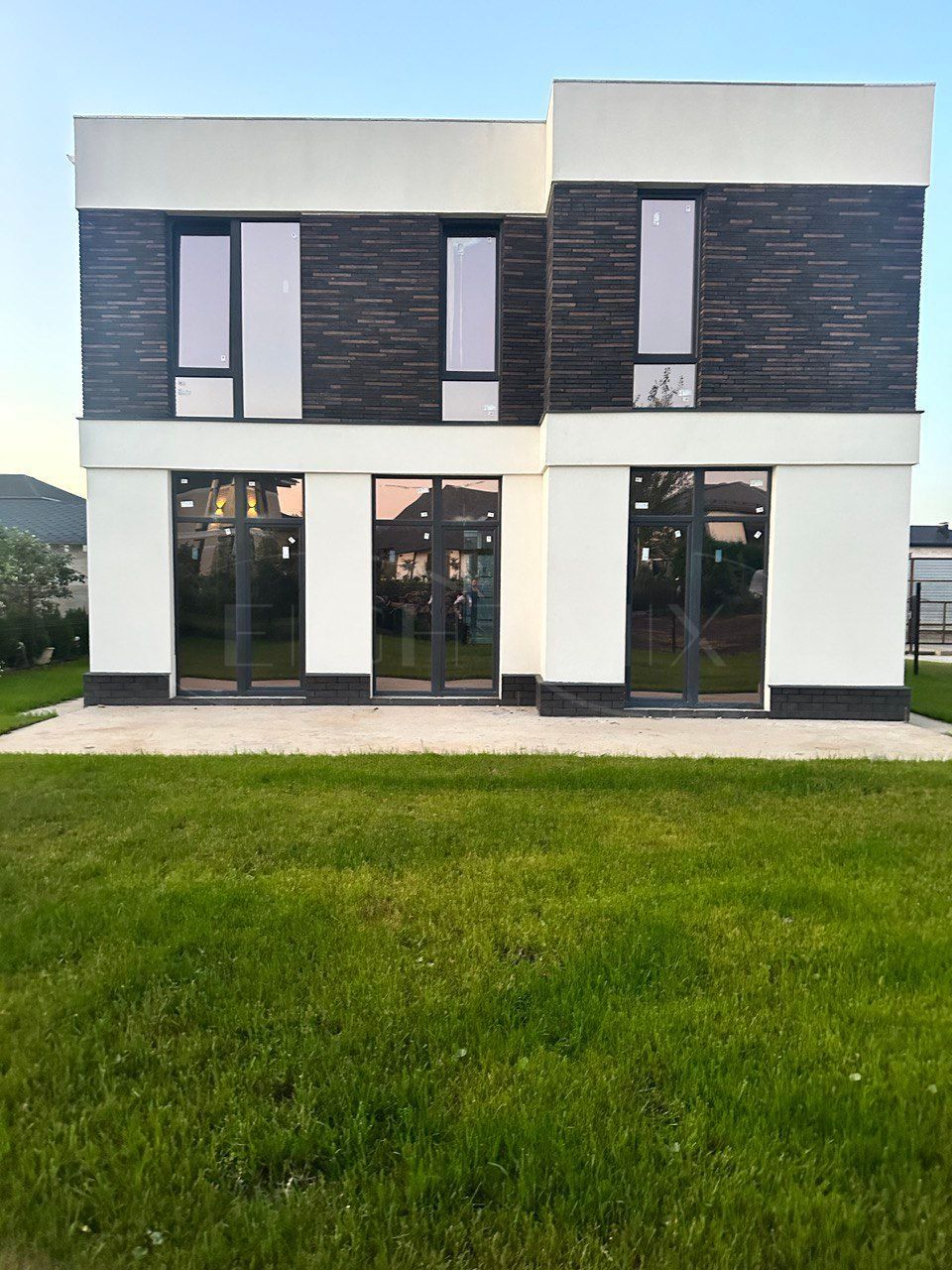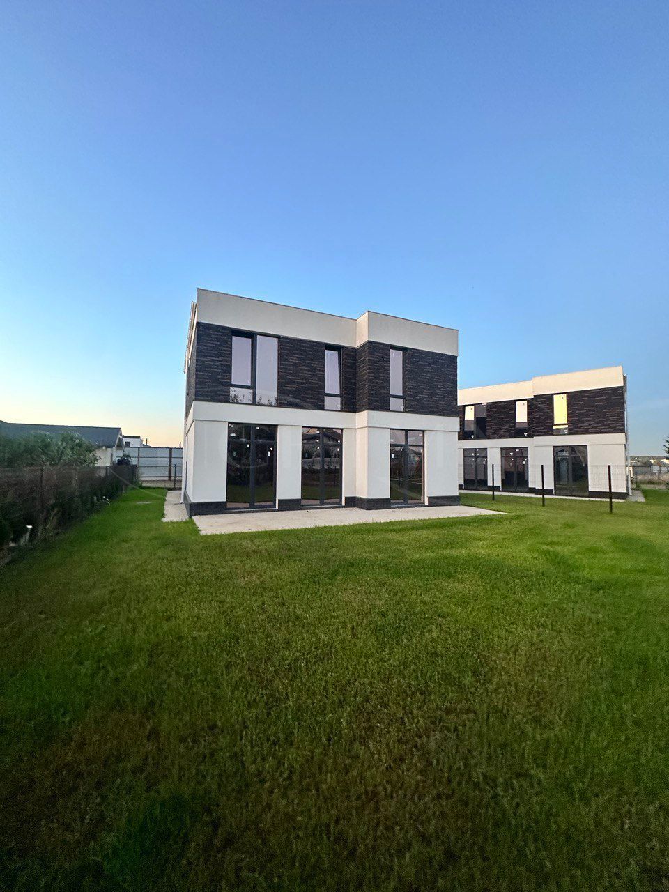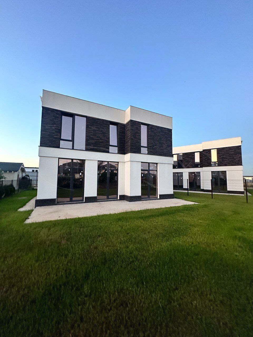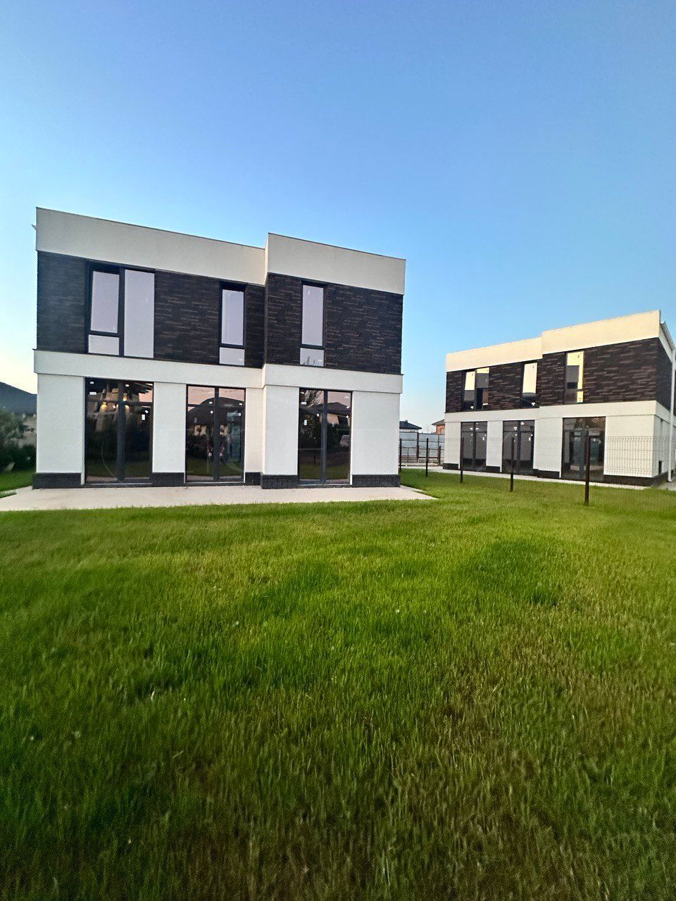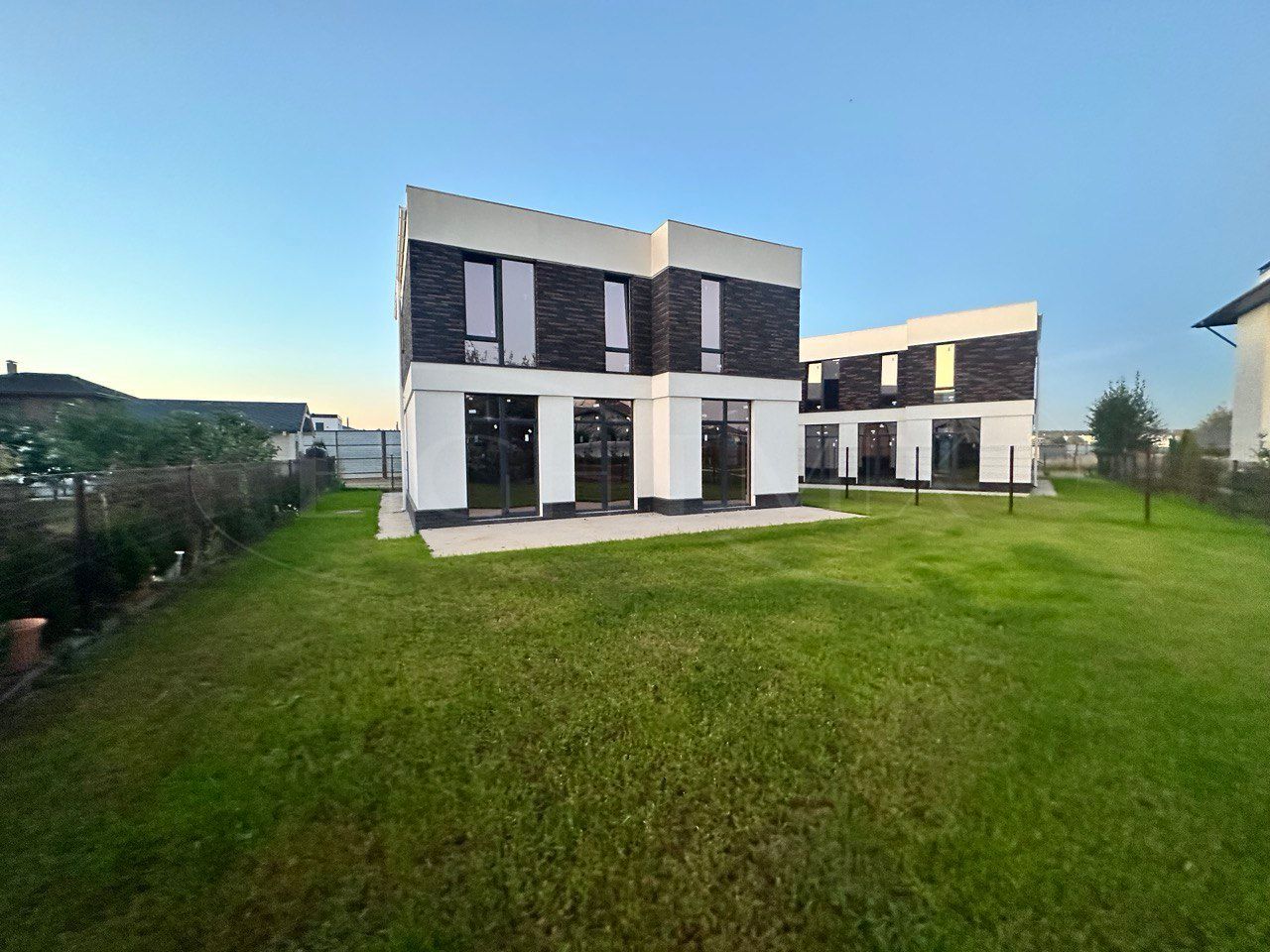 Участок с ухоженным газоном, вокруг дома уложена брусчатка, предусмотрено парковочное место на 1 автомобиль.